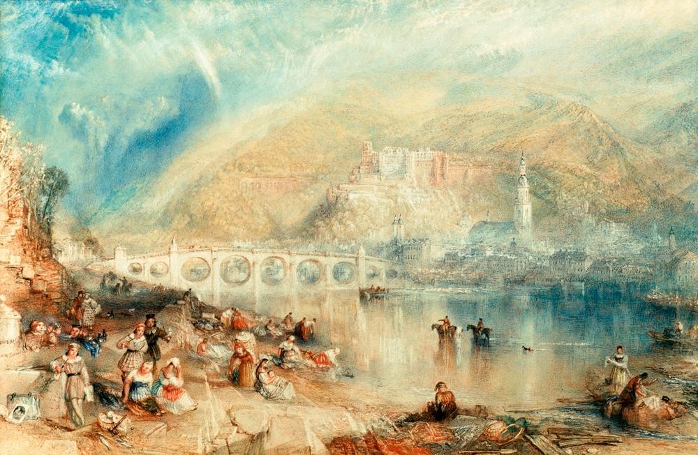 JOSEPH MALLORD WILLIAM TURNER, Heidelberg mit einem Regenbogen (Brücke,Geographie,Gesellschaftliches Leben,Schloss,Student,Reiter,Pfeife (Tabak),Rauchen,Fluss,Stadtansicht,Englische Kunst,Wäsche,Ufer,Frauenleben,Romantik,Topographie,Wäscherin,Alltag)